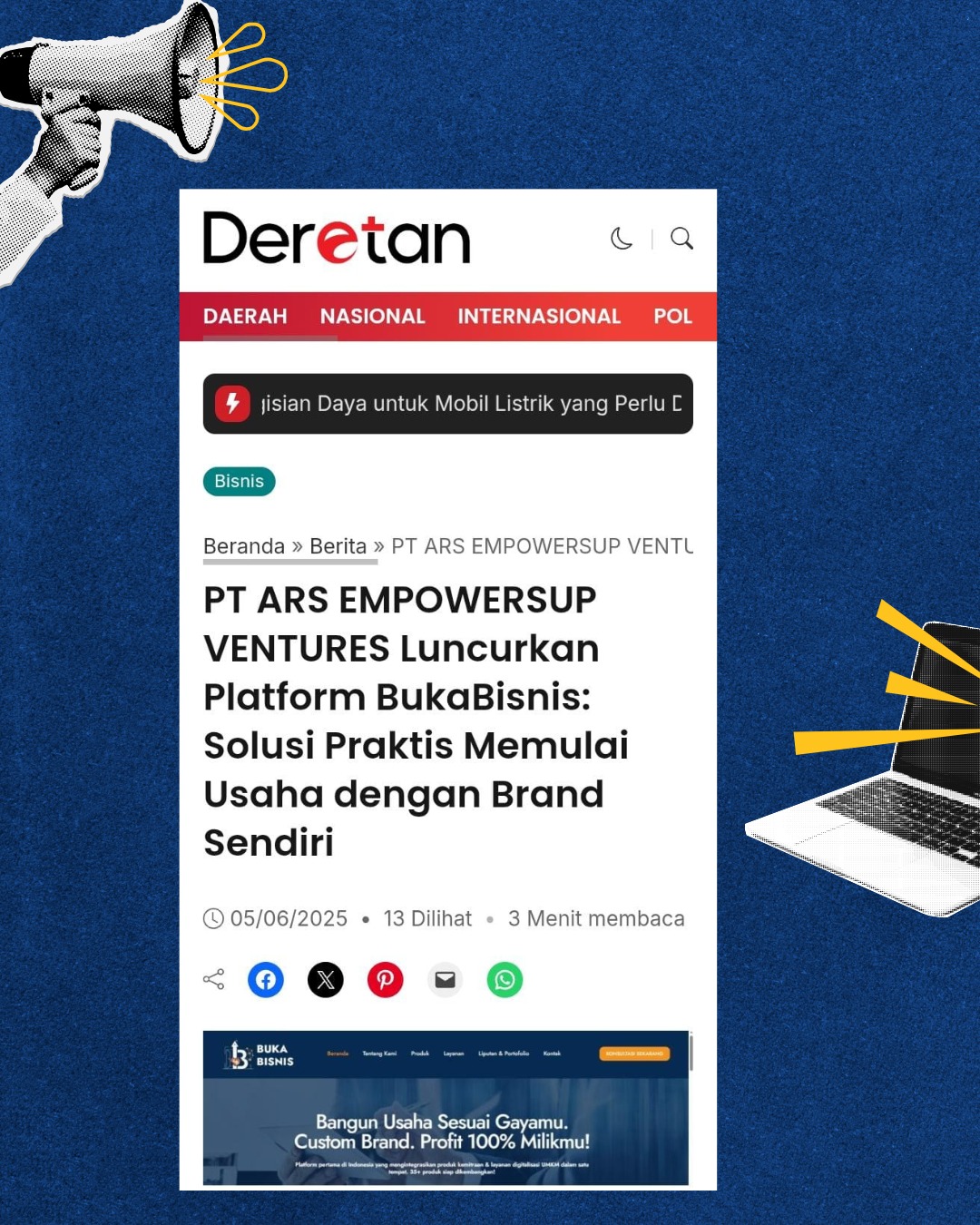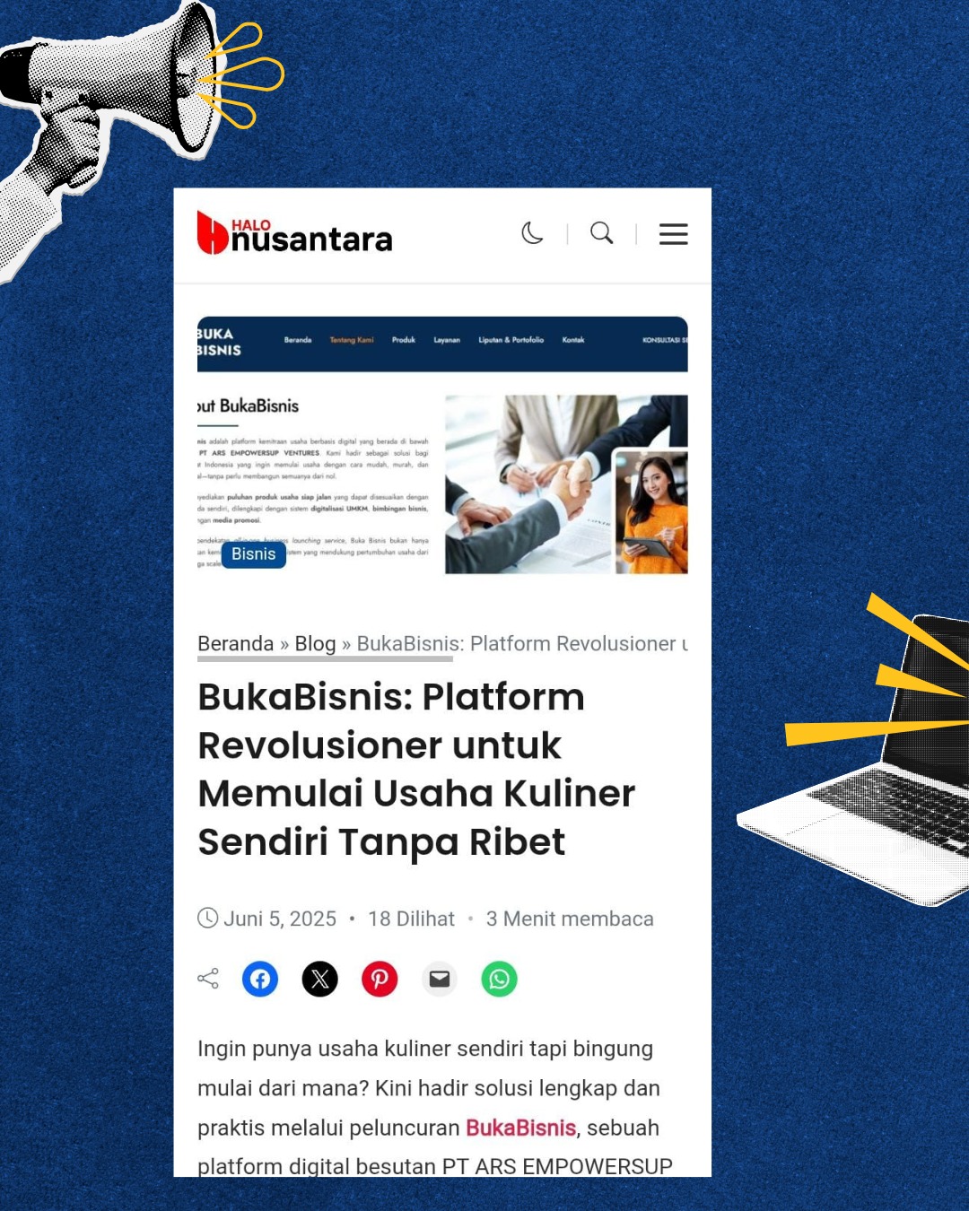BukaBisnis adalah platform kemitraan usaha di bawah naungan PT ARS EMPOWERSUP VENTURES yang telah aktif membangun ekosistem bisnis kuliner modern. Kami tidak hanya membekali mitra dengan produk siap jual, tetapi juga telah mendapat sorotan dari berbagai media dan komunitas bisnis sebagai solusi bisnis masakini yang terintegrasi dengan digitalisasi UMKM.